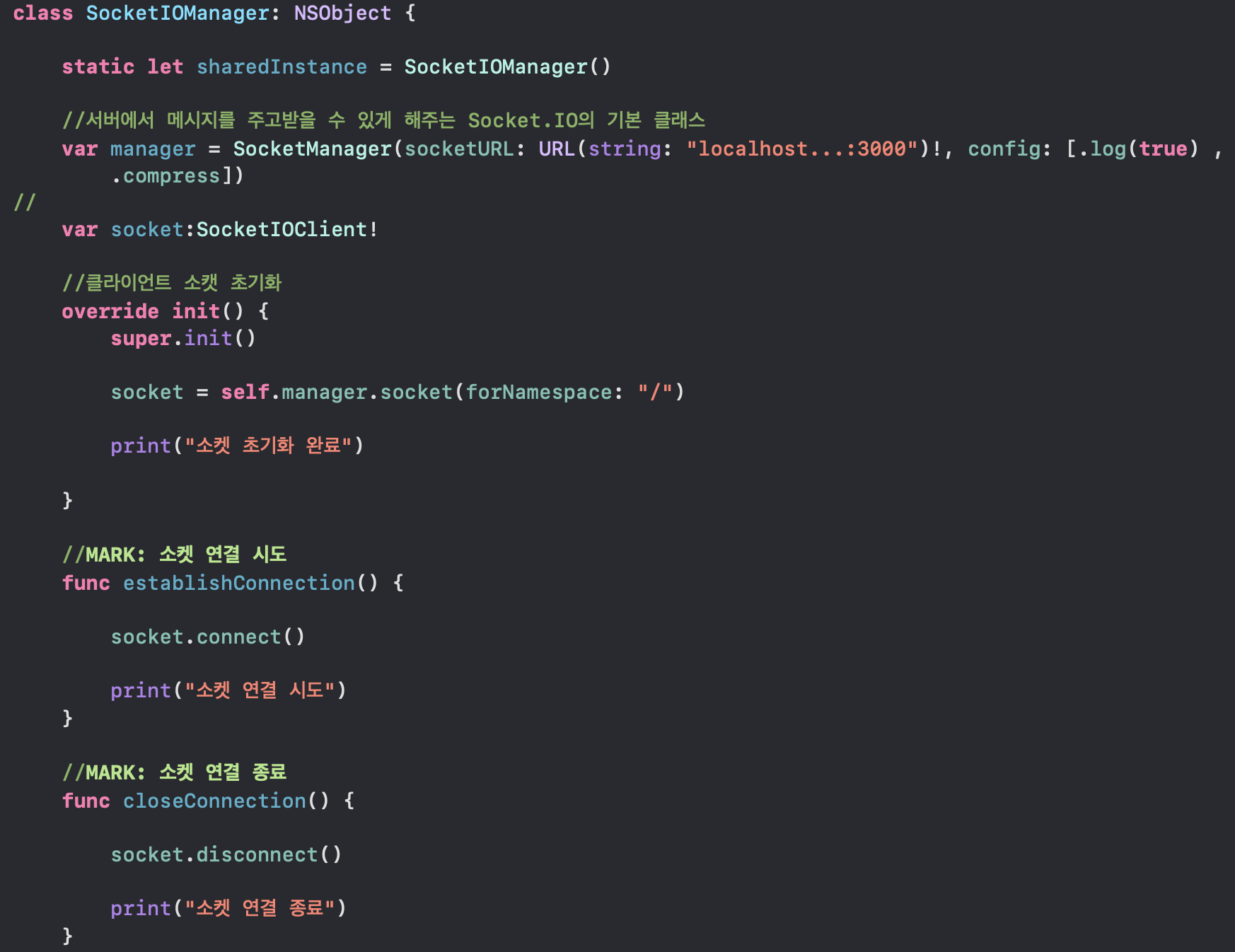 다음은 데이팅 앱 프로젝트에 만든 SocketIOManager 파일 안에 있는 코드 중의 일부이다. establishConnection() 과 closeConnection() 함수는 각각 소켓을 커넥트하고 디스커넥트하는 함수를 채팅이라는 탭에 들어가고 나올때 불러주며 지속적으로 연결되는 상태에 들어가고 나오게 해준다. 위의 개념만 보았을 때는 상당히 복잡해보이고 어려워 보이는 과정들을 위와같은 아주 간단한 코드들(socket.connect(), socket.disconnect())로 구현할 수 있다.