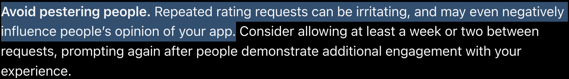 2. Avoid Pesting People. Repeated rating prompts can be irritating, and may even negatively influence the user’s opinion of your app. Allow at least a week or two between rating requests and only prompt again after the user has demonstrated additional engagement with your app.