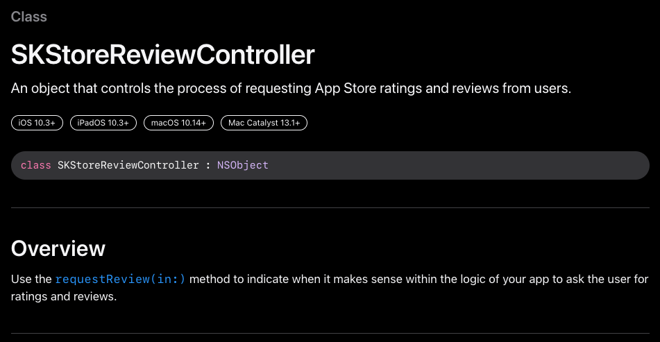 리뷰 요청을 위해서는 StoreKit에 있는 SKStoreReviewController의 requestRiview() 함수를 불러와줘야 한다.