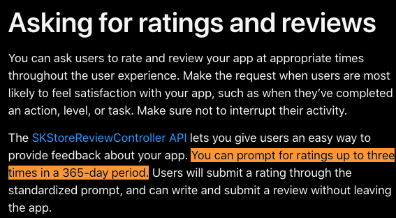 반복적인 리뷰요청으로 사람들을 괴롭히면 앱에 부정적인 영향이 갈 수 있습니다. 요청 사이엔 최소 1~2 주의 시간이 필요합니다.