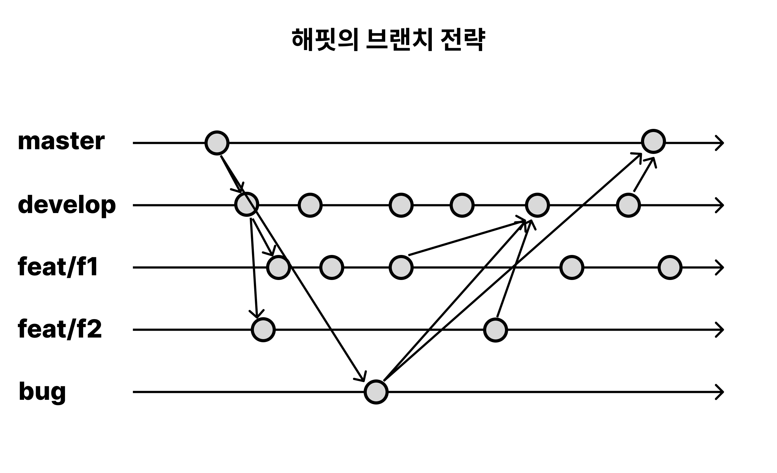당시 해핏에 적용된 룰을 기반으로 설명을 하자면, Git-flow는 메인 브랜치인 master와 develop, 그리고 release(초기 master에서 파생되는 브랜치이다)를 중심으로 하며, 보조적인 역할을 가진 브랜치들, 예를 들어 기능추가(당시 Feat으로 브랜칭하였다), 버그대응(당시 Bug로 브랜칭하였다) 등 브랜치에 명확한 롤(role)을 부여한 브랜치들이 있다.